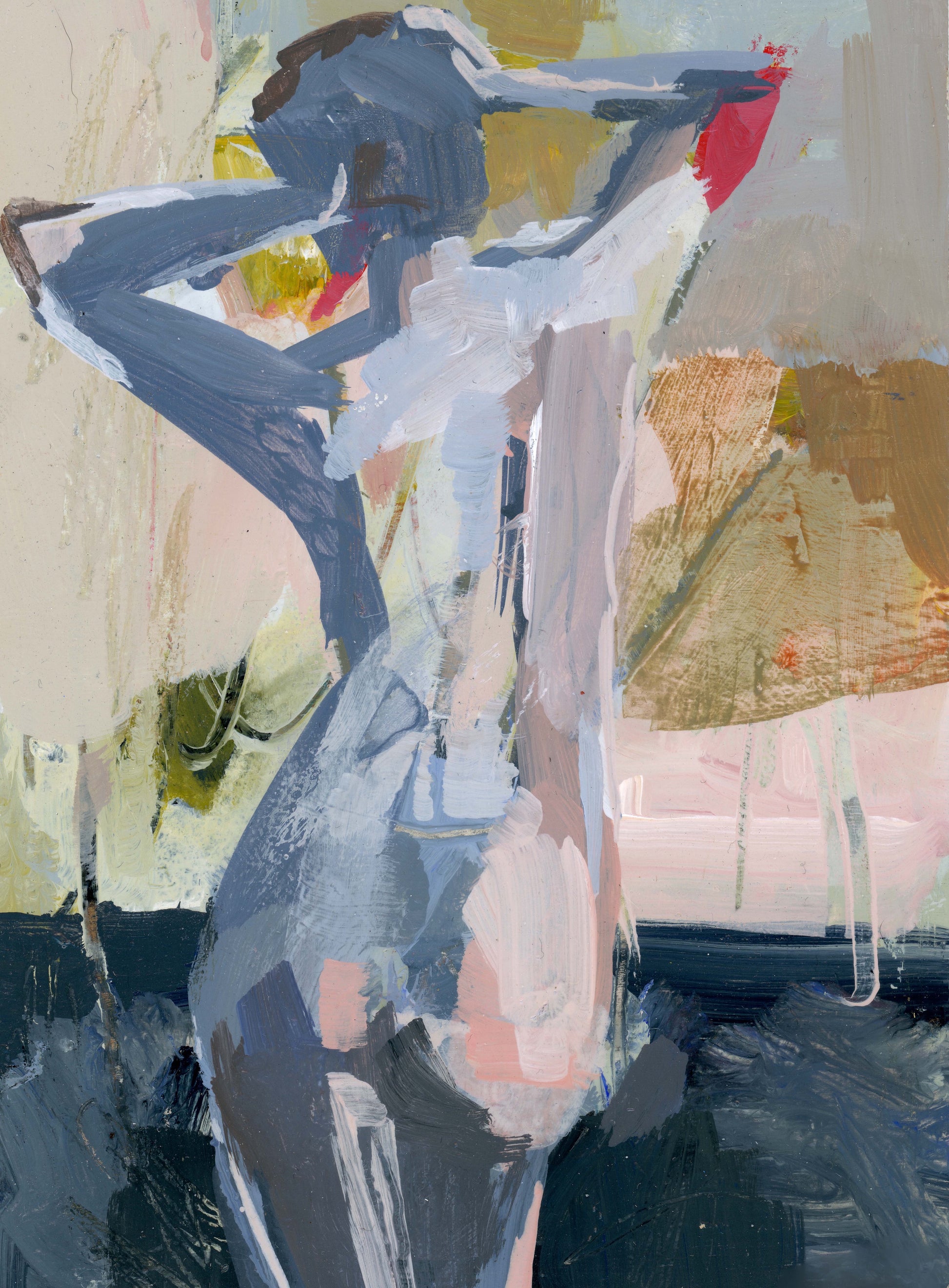 Rendered with bold, confident strokes of slate and charcoal, the figure feels simultaneously substantial and ethereal, appearing to merge with the atmospheric layers of the background. The inclusion of a singular, striking red accent at the fingertips adds a touch of physical warmth and vitality, suggesting the heat of the body against the cool, coastal air. This interplay between the grounded, earthy tones of the skin and the cool cerulean shadows captures the raw, lived-in vulnerability that defines this figurative series.