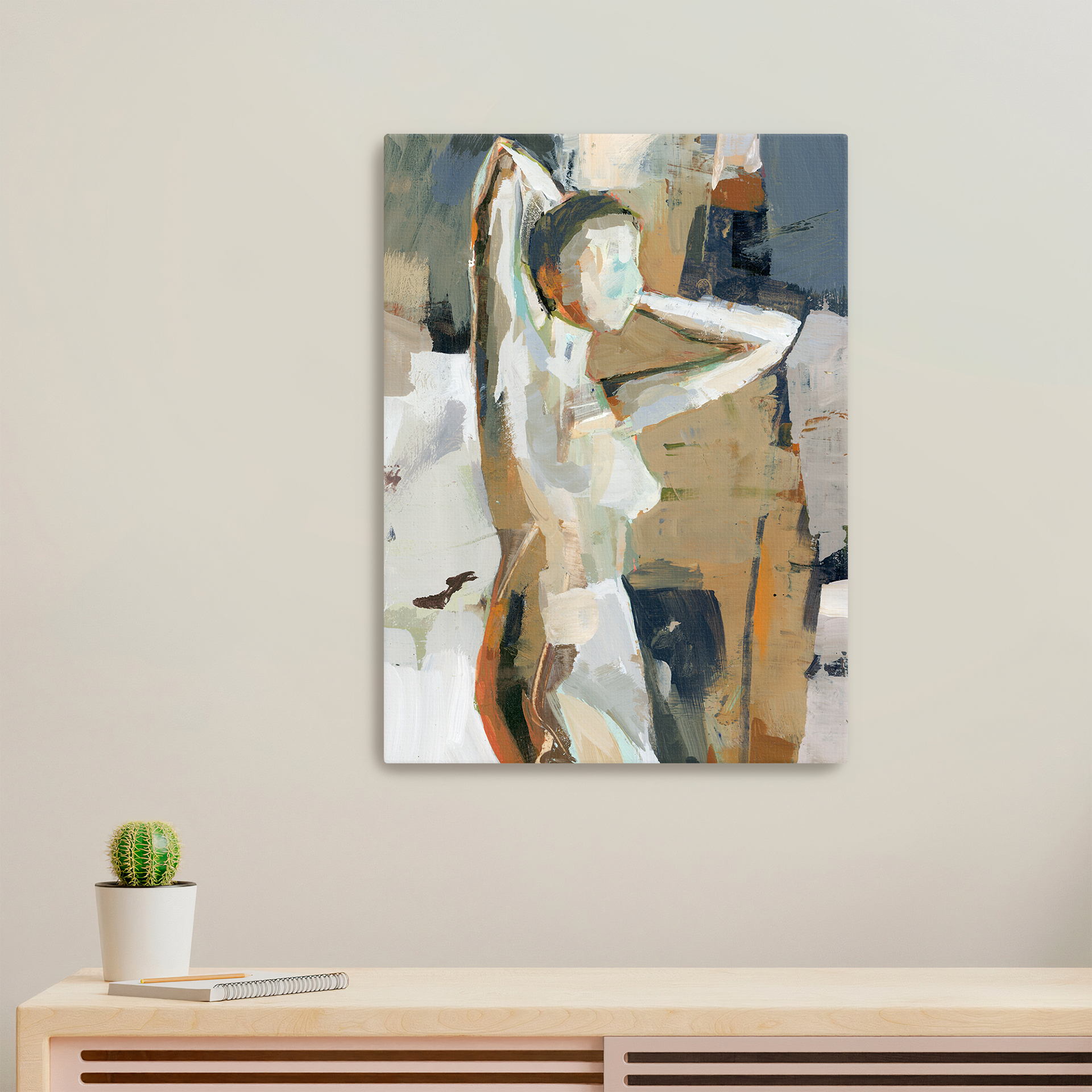 Atmospheric Grounding and Celestial Light Invite a sense of expansive, serene energy into your space with "Stone & Sky." This limited edition composition reimagines the human form through a breathtaking interplay of earthy foundations and ethereal light. Sculptural layers of warm ochre, raw umber, and slate grey define the figure, set against an atmospheric backdrop of celestial blue and cloud-white to reveal the enduring, resilient spirit of the form. It is a visual celebration of the harmony between our grounded physical presence and our limitless internal horizon.