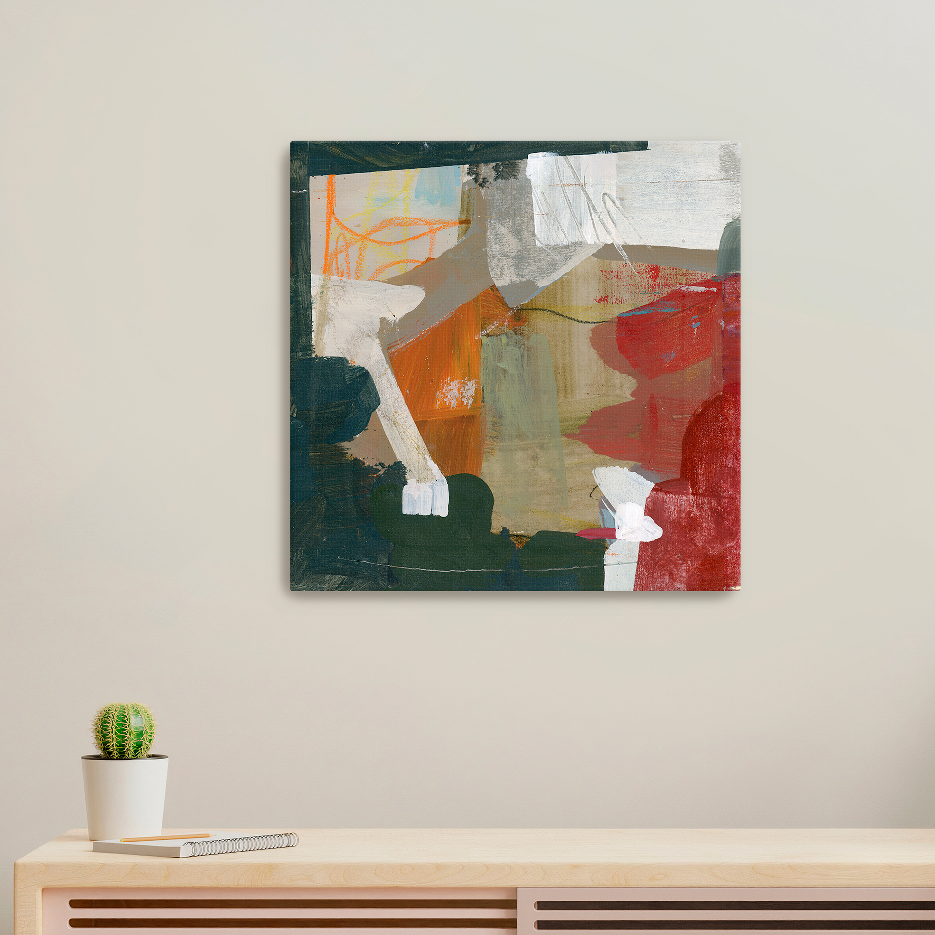 Ground your space in the raw, organic momentum of "Terra Flux." This composition navigates the tension between structured earth tones and fluid movement, where dense anchors of forest green and deep slate collide with vibrant surges of terracotta and crimson. Kinetic, golden-yellow line work dances across the surface, weaving together layers of soft parchment and bold, gestural blocks to evoke a shifting, living landscape.