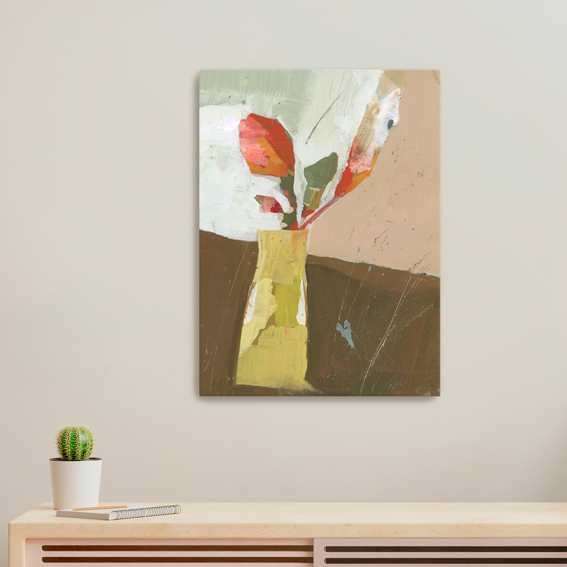 Complex Warmth in Bloom Wrong Side of Beige explores the beauty of unconventional color harmonies. This composition features a vibrant cluster of coral and orange petals emerging from a pale yellow vase, set against a multi-tonal backdrop of deep umber and soft tan. Large, gestural sweeps of off-white and sage green create a sophisticated, lived-in energy that challenges the simplicity of its name, offering a rich visual warmth that anchors any space.